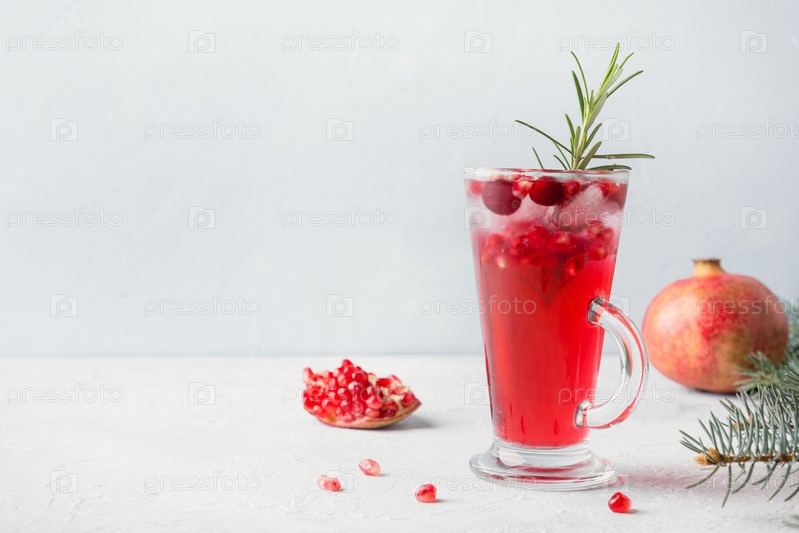 Гранатовый рождественский коктейль с розмарином, шампанским, содовой на сером бетонном столе