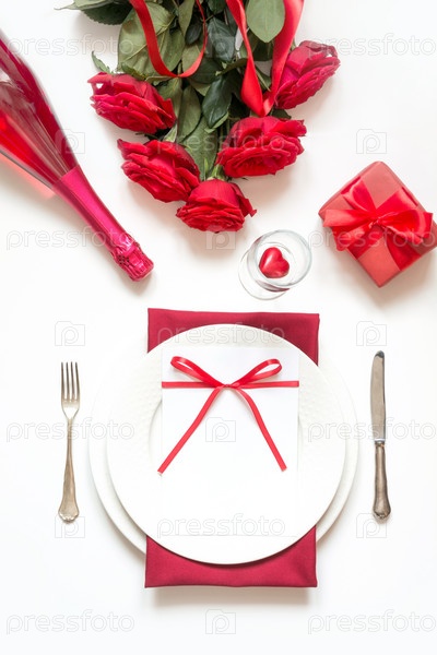 Романтическая сервировка стола с букетом красных роз и подарком. Вид сверху. День Святого Валентина