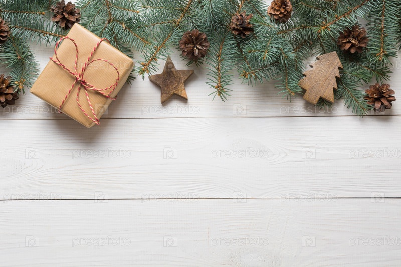 Рождественская рамка из еловых веток, подарков и деревянных игрушек на белой деревянной доске. Вид сверху