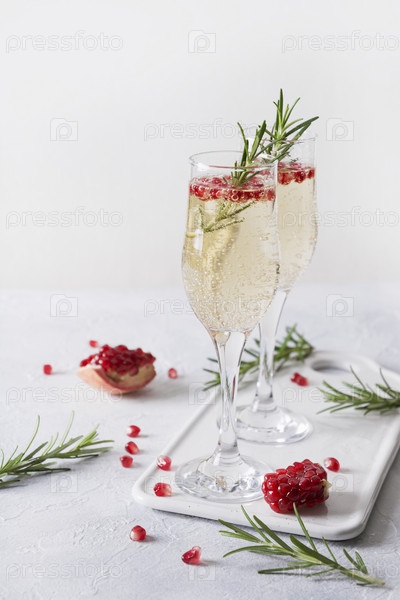 Гранатовый рождественский коктейль с розмарином, игристое вино на белом столе. Рождественский напиток
