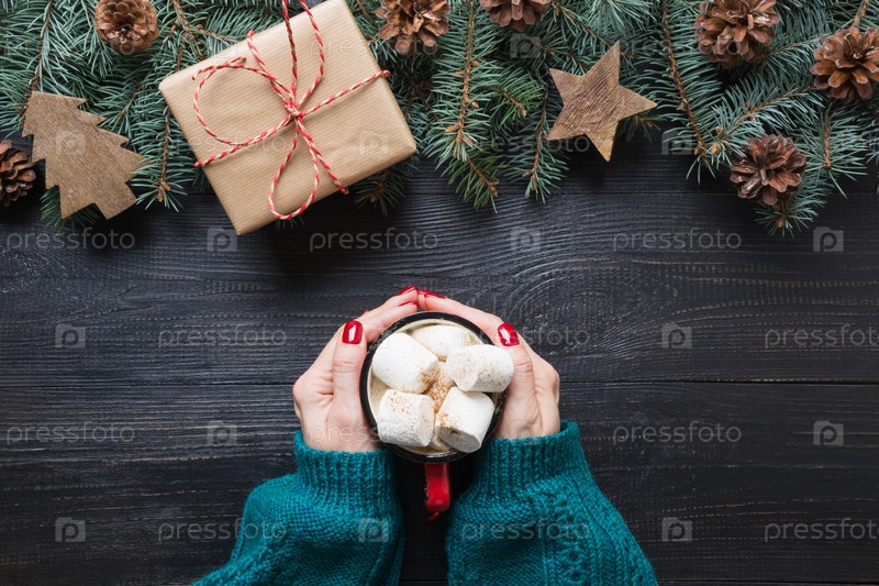 Рождественская композиция из еловых веток, деревянных игрушек и уютного кофе с зефиром на деревянной доске. Вид сверху