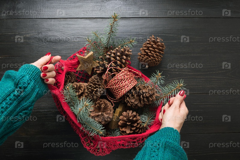 Женщина держит в руках сетчатый мешок с рождественским декором без отходов, натуральными конусами для подарков ручной работы и самодельного изготовления