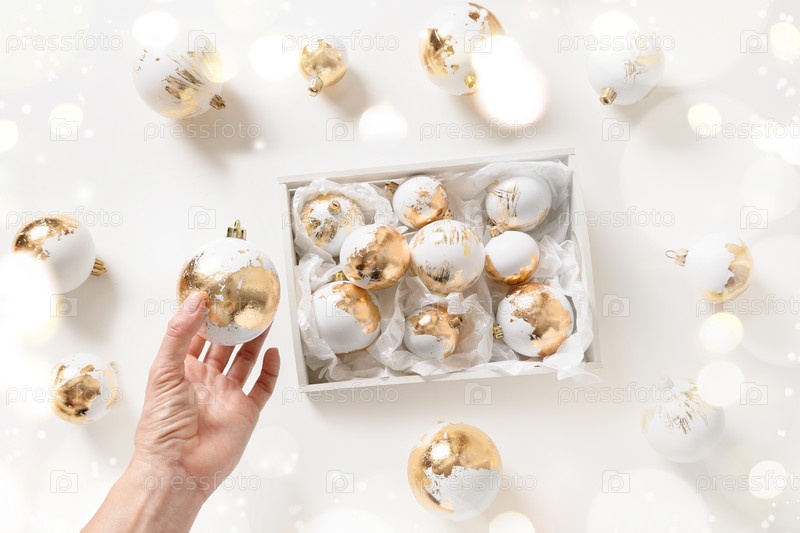 Женщина готовит рождественские белые и золотые шарики для украшения рождественской елки. С Новым Годом