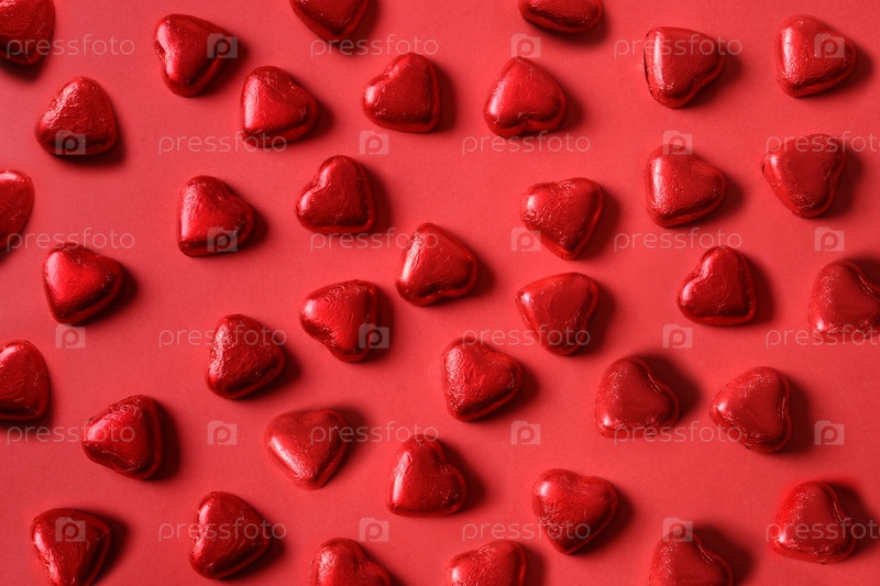 Шаблон романтических шоколадных конфет в виде сердца в красной фольге на красном фоне. Открытка ко дню святого Валентина. Концепция любви