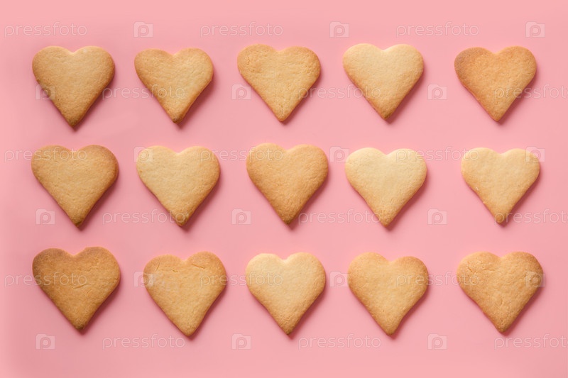 Патерн домашнего печенья в форме сердца на розовом фоне. Вид сверху. Открытка на день Святого Валентина. Плоская укладка