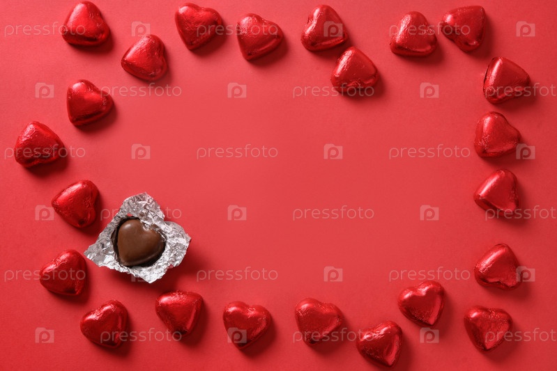 Романтические шоколадные конфеты в виде сердца в красной фольге в виде рамки на красном фоне с копировальным пространством. Открытка ко дню святого Валентина. Концепция любви