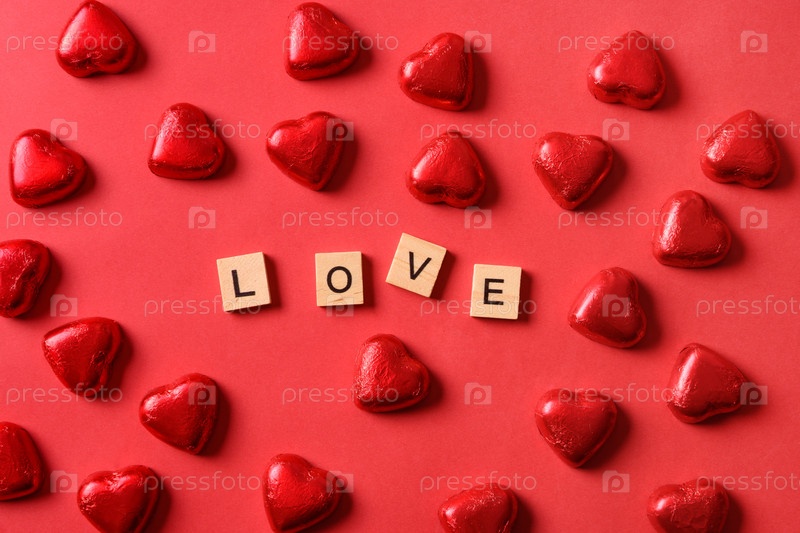 Романтические шоколадные конфеты в виде сердца в красной фольге и тексте - Любовь на деревянных блоках. Открытка на день Святого Валентина на красном фоне