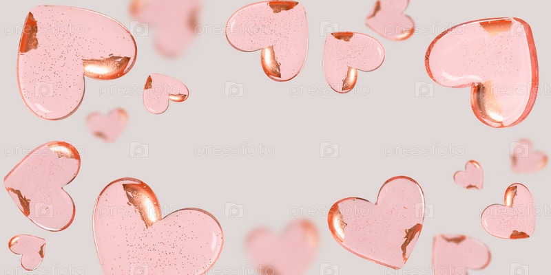 Открытка на день Святого Валентина из розовых летающих сладостей в форме сердца на бежевом фоне. Баннер. Копировать пространство
