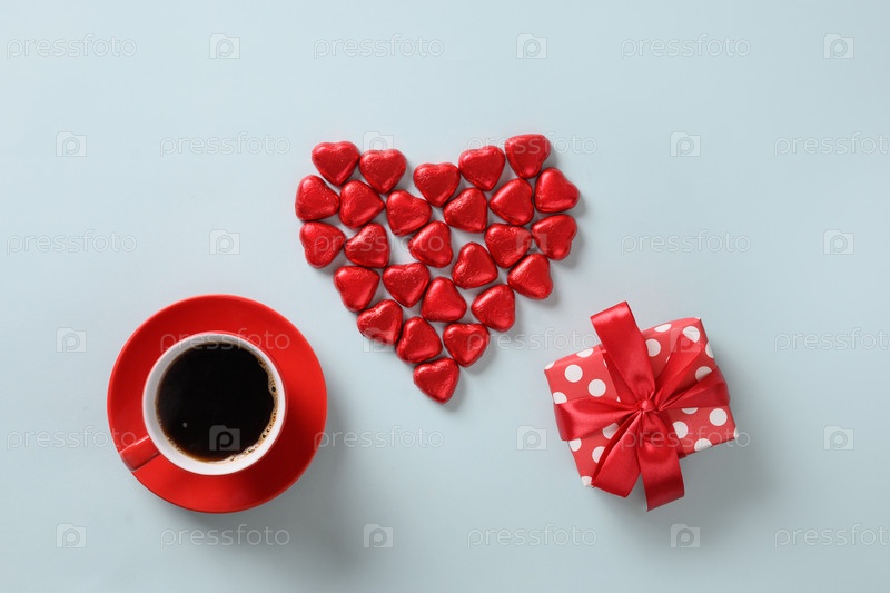 Красные сердечные сладости, подарок и чашка кофе на синем фоне. День Святого Валентина