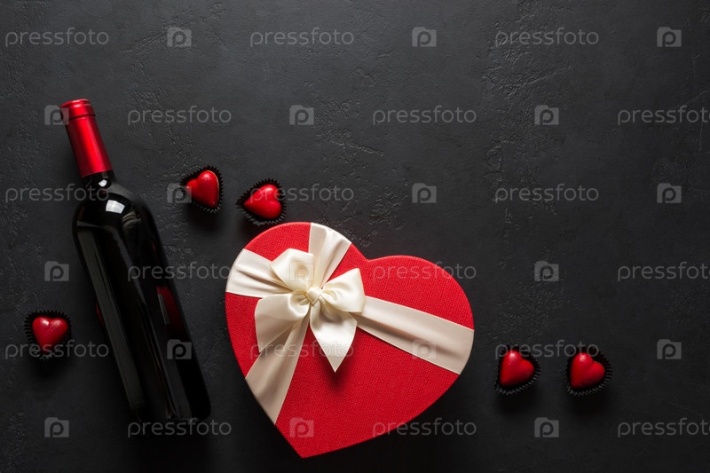 Бутылка красного вина и подарок сердца на черноте. Валентинка