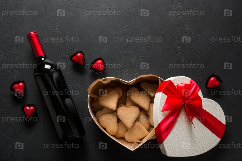 Бутылка красного вина и печенья сердца в подарок на черноте. День Святого Валентина