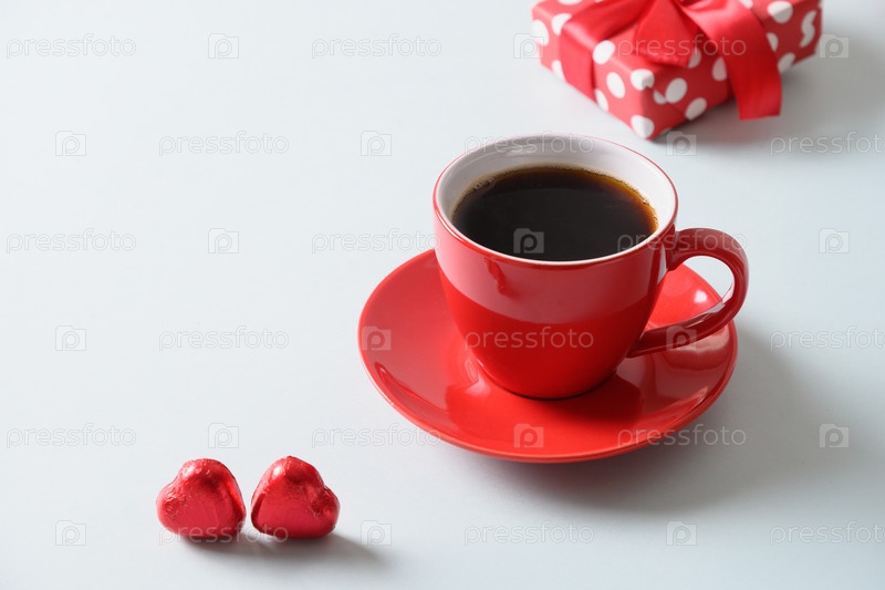 Красная чашка кофе, сердечные сладости и подарочное печенье на синем фоне. День Святого Валентина