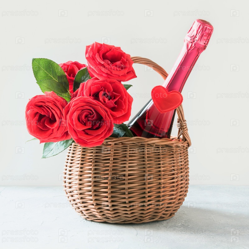 Подарочная корзина на день святого валентина, букет красных роз, шампанское и сердце на белом