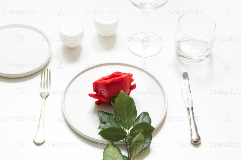 День святого Валентина или день рождения романтический ужин. Элегантная сервировка стола с красной розой