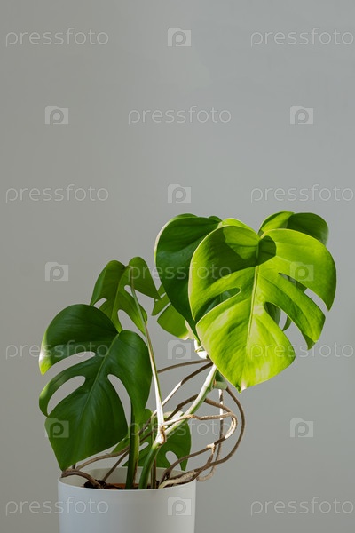 Вертикально. Растение монстра в белом горшке на сером фоне. Концепция минимализма. Monstera deliciosa или швейцарская сыровая фабрика на фоне тропических листьев в горшке. Дневный свет, резкие тени