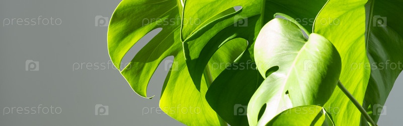 Баннер. цвет монстра в белом горшке на сером фоне. Концепция минимализма. Monstera deliciosa или швейцарская сыровая фабрика на фоне тропических листьев в горшке. резкие тени