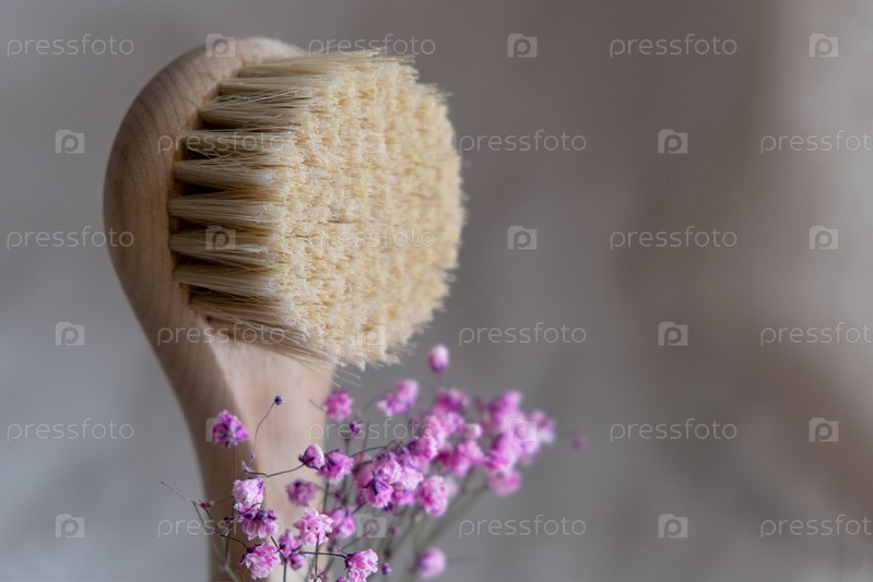 Массажная щетка для лица с натуральной щетиной на льняном фоне с корой и сушеными цветами. концепция экологически чистой косметики