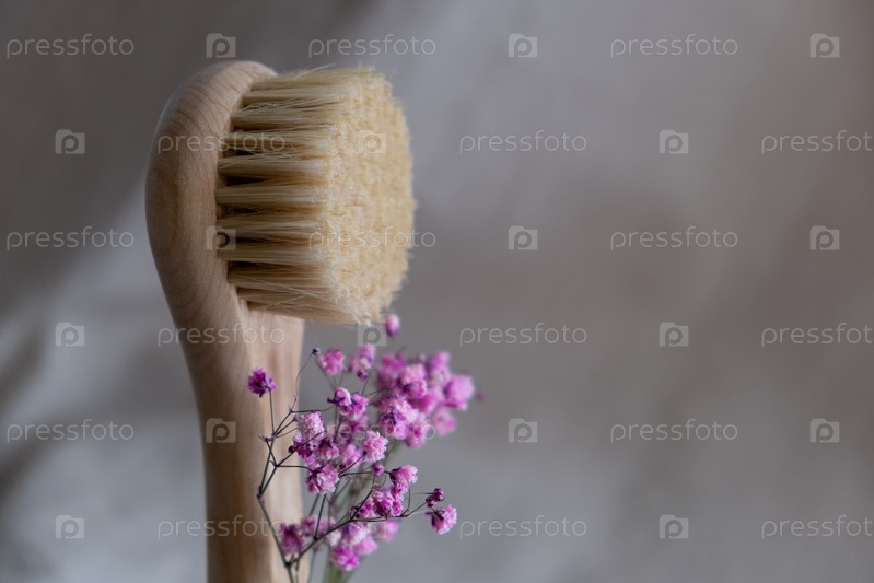 Массажная щетка для лица с натуральной щетиной на льняном фоне с розовыми и сушеными цветами. концепция экологически чистой косметики