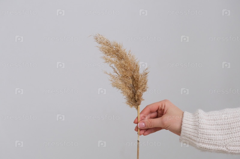 Рука женщины держит пампасную траву. Стебель тростникового шлейфа, сушеная пампасная трава, декоративная цветочная композиция из перьев для дома, новый модный домашний декор