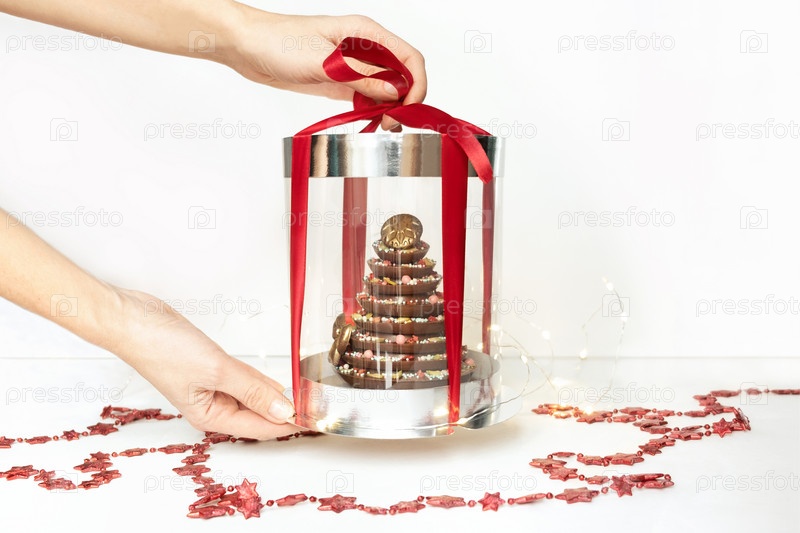 Новогодняя или новогодняя елка из шоколада своими руками в подарочной упаковке. Рождественская концепция еды
