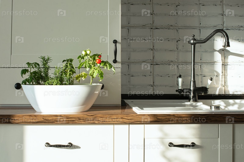 Помидоры черри и розмарин, выращенные в горшке в домашнем огороде, на белой кухне в скандинавском стиле