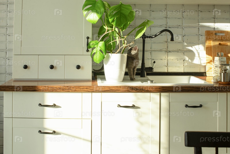 Растение монстера в белом горшке на белой кухне и маленькая серая домашняя кошка. Концепция комнатных растений и домашних животных. Листья монстеры деликатесной или тропические листья швейцарского сыра