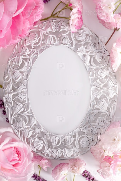 Цветочная рамка из розовых цветов на белом или розовом фоне. Плоская планировка, вид сверху. Концепция весны и лета. Дизайн рамы головы розы ромашки. Пустое место. Шаблон романтической открытки