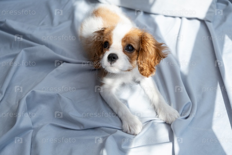 Ой с собакой в обнимку лежит в постели. Спите с домашними животными. милый щенок кавалер кинг чарльз спаниель. ой с собакой в обнимку лежит в постели. Спите с домашними животными. милый щенок кавалер кинг чарльз спаниель. Баннер