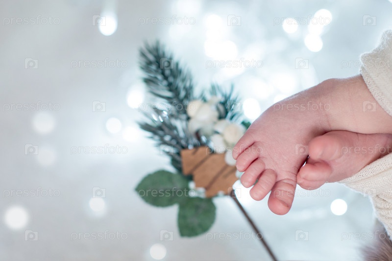 Ножки новорожденного с рождественскими украшениями. новогодняя концепция дерева 2021 года. Копировать пространство