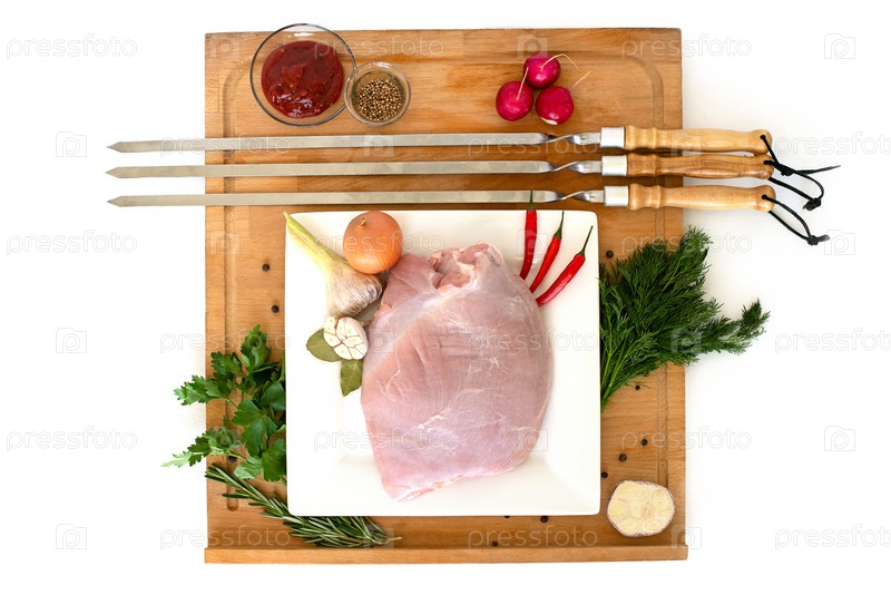 Сырое мясо индейки, филе для запекания на шампурах. Подготовка барбекю. ингредиенты