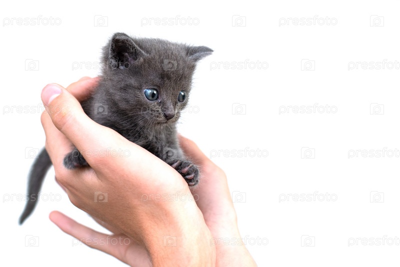 Серый кот в руках на белом фоне изолировать. Новорожденный серый котенок