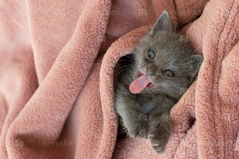 Маленький серый кот в одеяле зевает. Длинный язык