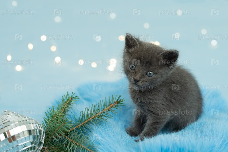 Рождественский котенок. маленькая кошка с елкой и огнями. Синий фон, пространство для копирования