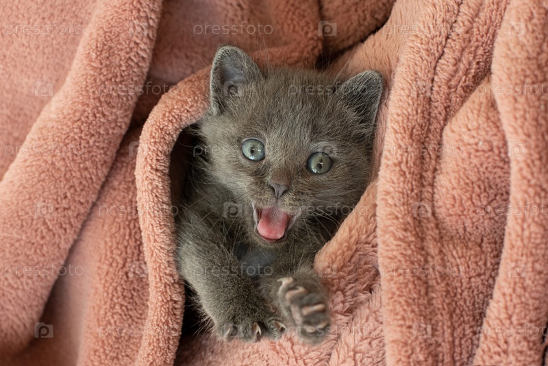 Маленький серый кот в одеяле зевает. Длинный язык