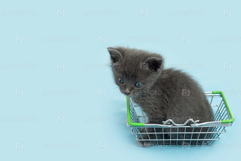 Серый котенок с корзиной для покупок. покупка животных. Зоомагазин, зоомагазин