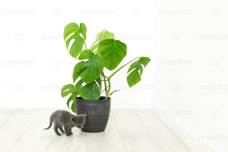 Серый котенок и домашнее растение монстера. Комнатный цветок в интерьере