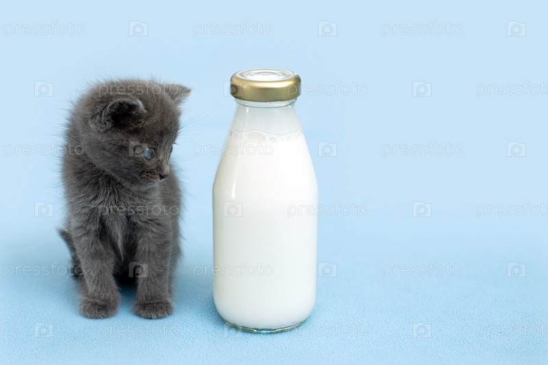 Котенок и бутылка молока. Серый кот с едой в корзине. Голубой фон. Скопируйте пространство