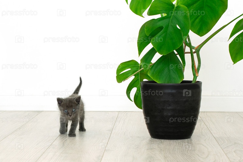 Серый котенок и домашнее растение монстера. Комнатный цветок в интерьере