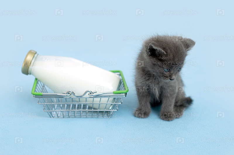 Котенок и бутылка молока. Серый кот с едой в корзине. Голубой фон. Скопируйте пространство