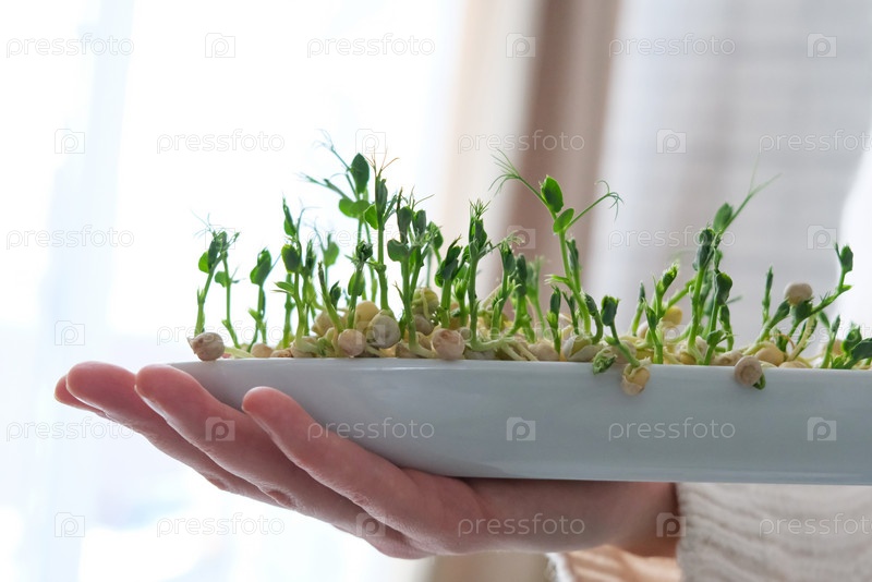 Микрозелень гороха в руках женщины. День Земли. Выращивание семян в домашних условиях. Место для текста. Концепция веганства и здорового питания. Выращивание саженцев