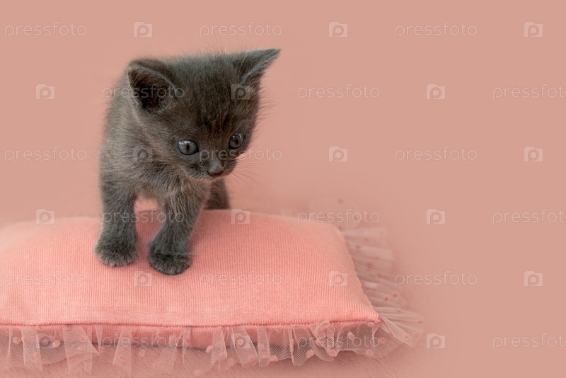 Серый котенок с когтями на розовой подушке