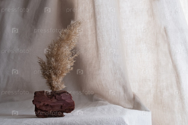 Естественный фон для эко-продуктов. Лен, кора дерева, зеленое и сухое растение, подиум