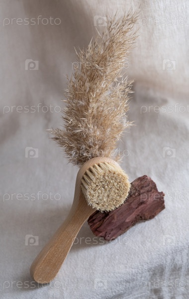 Массажная щетка для лица с натуральной щетиной на льняном фоне с корой и сушеными цветами. концепция экологически чистой косметики