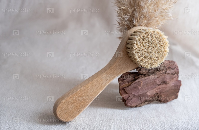 Массажная щетка для лица с натуральной щетиной на льняном фоне с корой и сушеными цветами. концепция экологически чистой косметики