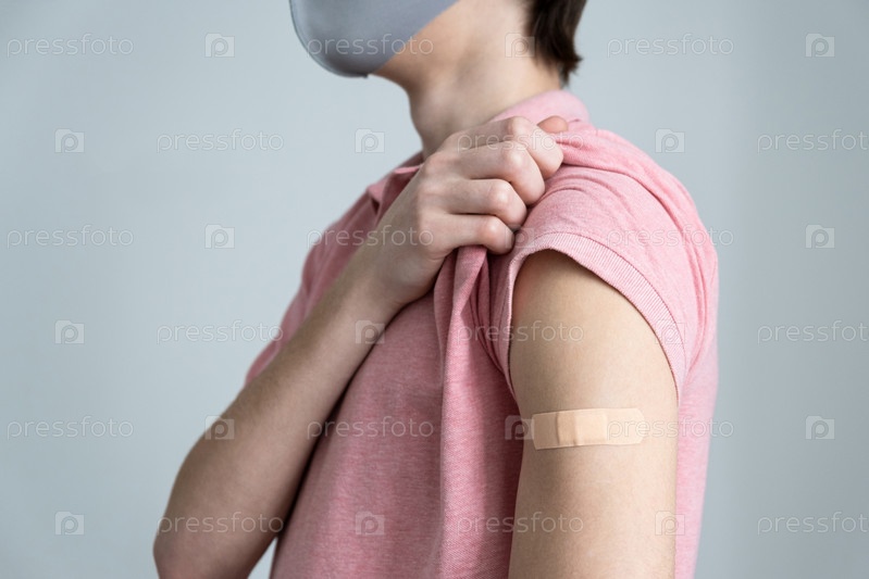Пластырь на руке после прививки от инфекции COVID-19