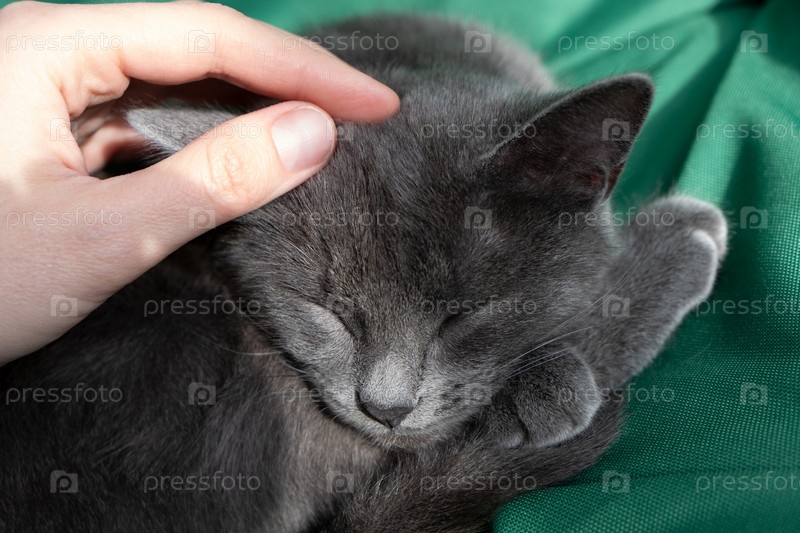 Крупным планом портрет серого кота с женской рукой на зеленом фоне. Хозяйка нежно гладит кошку. Концепция ветеринарной клиники или корма для животных