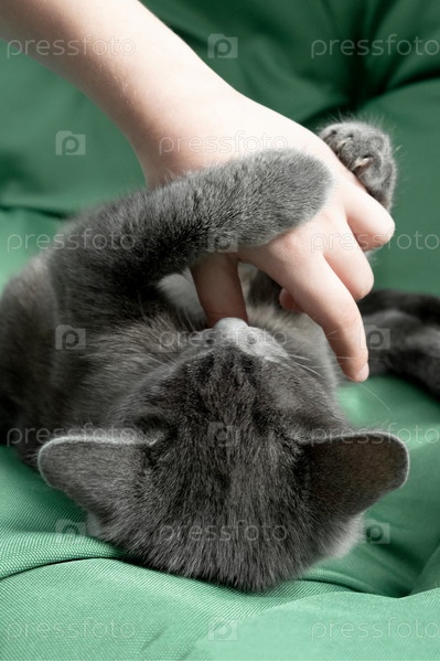 Крупным планом портрет серого кота с женской рукой на зеленом фоне. Хозяйка нежно гладит кошку. Концепция ветеринарной клиники или корма для животных