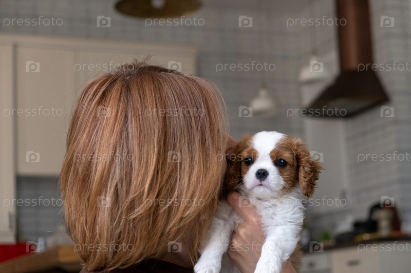 Кавалер-кинг-чарльз-спаниель Бленхейм. Крупный план портрета милого щенка с женщиной-хозяйкой