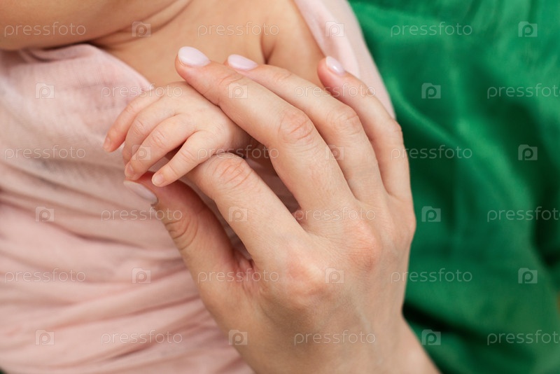 Мама держит за руку новорожденного. Любовь и нежность. День матери