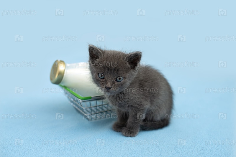 Котенок и бутылка молока. Серый кот с едой в корзине. Голубой фон. Скопируйте пространство